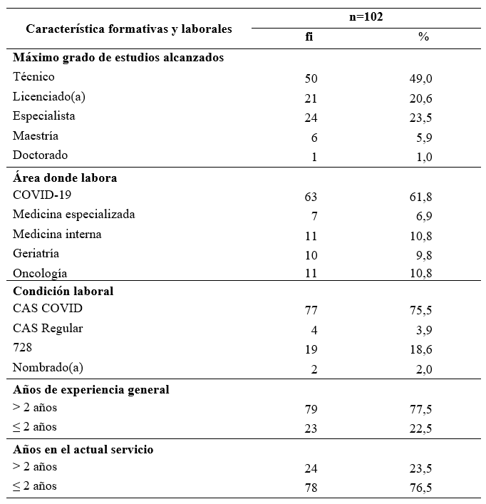 La mayoría de los profesionales de enfermería incluidos en el estudio tenía un nivel formativo de técnico superior (49%). El 61,8% trabajó en el servicio especial de atención al paciente con COVID-19, el 75,5% laboró bajo la modalidad de CAS COVID-19 y el 77,5% evidenció más de dos años de experiencia profesional en general; pero, el 76,5% se incorporó al servicio de atención en el que se encontraban dos o menos años antes (tabla 2).