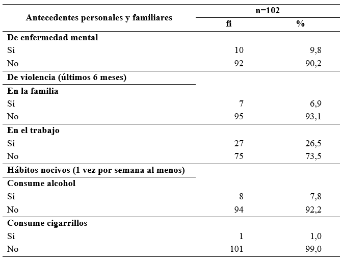 La mayoría no informó antecedentes familiares de enfermedad mental (90,2%). Con respecto a la presencia de antecedentes de violencia, el 93,1% no padeció de violencia familiar, siendo una incidencia menor de ausencia de violencia en el trabajo (73,5%) en los últimos 6 meses. El 92,2% declaró no consumir alcohol y el 99% no fumaba, teniendo en cuenta una frecuencia de una vez semanal al menos (tabla 3).