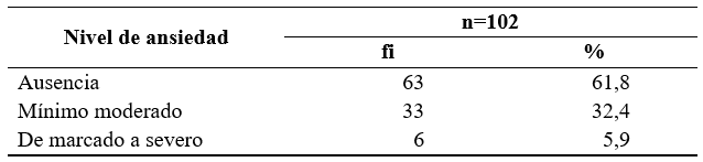 El 61,8% de los profesionales de enfermería no manifestó ansiedad según los resultados del instrumento, existiendo la menor incidencia en el nivel de marcado a severo (5,9%) (tabla 4).