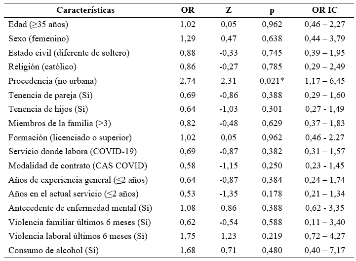En el contexto de estudio predominó: el grupo etario de mayores de 34 años, el estatus de soltero(a), el sexo femenino, la filiación religiosa católica, los residentes en zona urbana, profesionales de enfermería con nivel técnico superior, los que trabajaban directamente en la atención al paciente con COVID-19, no tener antecedentes familiares de enfermedad mental, sin reportes de violencia familiar o laboral y ausencia de hábitos de tabaquismo o alcoholismo.
