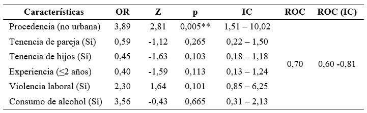 El análisis de regresión logístico bivariado permitió establecer que el hecho de residir en zonas rurales o urbano marginales incrementaba la probabilidad de padecer de ansiedad en 2,74 veces más que aquellos que vivían en zona urbana (p=0,021). Aunque, sin significación estadística en el contexto de estudio (p>0,05), otras variables tuvieron valor de OR mayor que uno: edad mayor de 34 años (1,02); sexo femenino (1,29); nivel de formación académica de licenciatura o mayor (1,02); antecedentes familiares de enfermedad mental (1,08); víctima de violencia en el trabajo en los últimos 6 meses (1,75) y consumir alcohol una vez por semana al menos (1,68) (tabla 5).