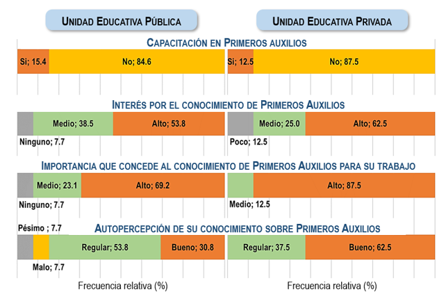 Entre los participantes predominaron aquellos que no habían recibido capacitación acerca de primeros auxilios en ambas unidades educativas: 84,6% en la pública y 87,5% en la privada (gráfico 1).