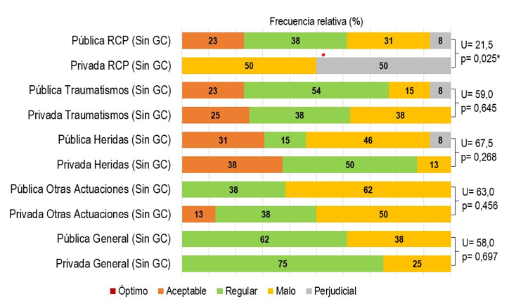 Únicamente, se establecieron diferencias estadísticamente significativas entre los datos de los grupos por unidad de origen, relativos al nivel de conocimientos sobre reanimación cardiopulmonar (RCP) (p=0,025; U=21,5); evaluándose al 100% de los participantes de la entidad privada en las categorías de malo o perjudicial (gráfico 2).