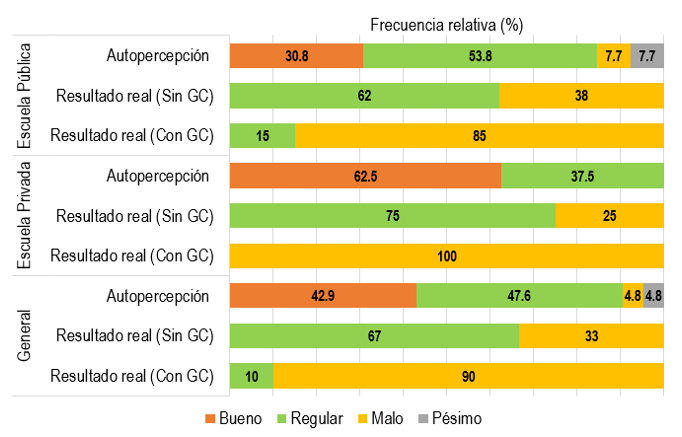 En la escuela privada, el 62,5% de los docentes percibió su autopreparación como buena; sin embargo, en la pública solo el 30,8% la catalogaron de esa manera (gráfico 1).