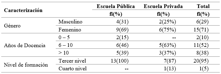 Se analizó la totalidad de la población, conformada por 13 docentes de una escuela pública y ocho de una institución privada (21 docentes en total) que mostraron su disposición para participar en la investigación, los cuales firmaron previamente un documento de consentimiento informado; entre los que predominaron los individuos de sexo femenino (71%), aquellos con experiencia docente de 6 a 10 años (52%) y los que no tenían formación de cuarto nivel (95%) (tabla 1).