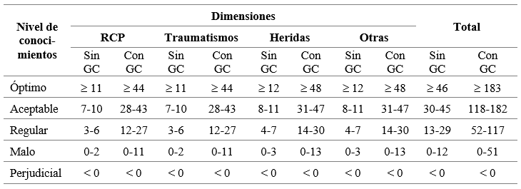 El nivel de conocimientos sobre los primeros auxilios en el personal docente participante se midió mediante un cuestionario anónimo, validado por Abraldes Valeiras y Ortín Aldeguer,(18) el que consta de 29 reactivos agrupados en 4 dimensiones: respiración cardio pulmonar básica, heridas y hemorragias, traumatismos y contusiones y otras posibles situaciones (golpes de calor, crisis convulsivas, avulsiones, diabetes, calambres musculares, entre otras); además, los evaluados manifiestaron el grado de confianza acerca de la respuesta emitida mediante la escala de Borg(19) de cuatro valores cuantitativos, desde 1 (muy poca) hasta 4 (total). Considerando la seguridad en la contestación emitida y el puntaje alcanzado según la certeza en la respuesta, el nivel de conocimientos se valora mediante un baremo de cinco categorías posibles: óptimo, aceptable, regular, malo y perjudicial (tabla 2).