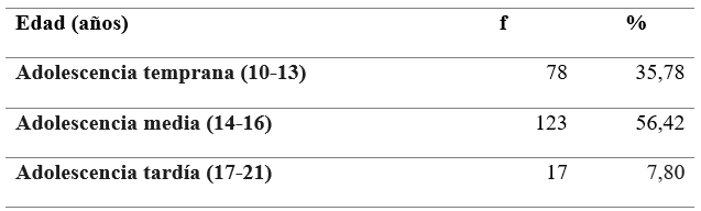 La población estuvo conformada por 218 estudiantes matriculados desde octavo grado de educación general básica hasta el segundo año de bachillerato general unificado de una unidad educativa en la ciudad de Guayaquil, provincia del Guayas, Ecuador; los que contaban con los correspondientes instrumentos de evaluación archivados en el Departamento de Consejería Estudiantil. Las edades oscilaron entre 12 y 17 años, con una media de 14 años, predominando los catalogados en la adolescencia intermedia (56,42%) según la clasificación de la UNICEF (tabla 1).