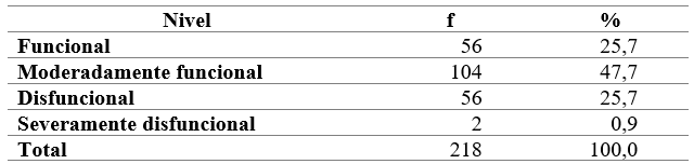 En la población de estudio, los resultados del procesamiento del nivel del funcionamiento familiar mostraron que preponderó la presencia de la clasificación de moderadamente funcional (47,7%), siendo menos del 1% las familias enmarcadas como severamente disfuncionales (tabla 2). Al procesar el instrumento, también se observó que preponderó el interés por el fortalecimiento de la funcionalidad de esa estructura social.