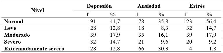 En congruencia con lo anterior, el nivel normal resultó el más frecuente en todas las dimensiones estudiadas: depresión (41,7%), ansiedad (35,5%) y estrés (56,4%) (tabla 3).