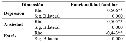 En el contexto investigado, las cifras de la prueba de correlación de Spearman de la funcionalidad familiar con respecto a las dimensiones depresión, ansiedad y estrés permitió establecer la presencia de una relación estadísticamente significativa, inversamente proporcional y de moderada intensidad con un valor p de 0,000 y Rho negativo que osciló entre -0,443 y -0,506 (tabla 4).