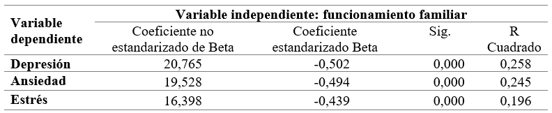 El análisis de regresión lineal mostró que las dimensiones depresión, ansiedad y estrés tenían dependencia de la variable funcionamiento familiar, con p = 0,000. Los valores Beta reflejaron que esta relación fue inversamente proporcional. Las cifras de R cuadrado posibilitaron establecer que los niveles de ese estado oscilaron entre el 19,6% y el 25,8% según la dimensión (tabla 5).