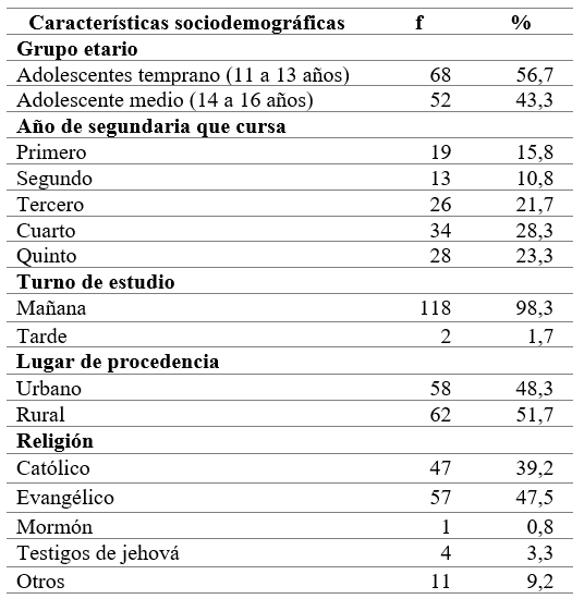 Los datos inherentes a las características sociodemográficas de los adolescentes mostraron un predominio del grupo de edades entre 11 y 13 años (56,7%), de los que cursaban el cuarto año de segundaria (28,3%) y aquellos que asistían a clases en el turno de la mañana (98,3%) (tabla 1).
