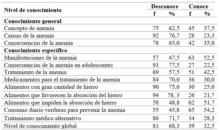 Con respecto a la calificación de conocimientos específicos sobre anemia en los adolescentes incluidos en el estudio, las cifras de desconocimiento predominaron. Las temáticas con más individuos aprobados fueron: manifestaciones de la anemia (52,5%), alimentos que impiden la absorción de hierro (51,7%) y consumo diario adecuado de verduras para prevenir la anemia (54,2%). En el resto de los tópicos, más del 57,5% de los involucrados tuvieron desconocimiento (tabla 2).