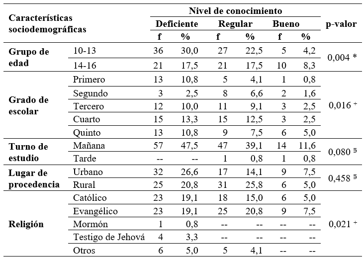 La categoría bueno en el nivel de conocimientos fue la que tuvo menor presencia en la población de estudio. Según la prueba de Rho de Spearman, esta variable se relacionó significativamente con el grupo etario (p=0,004). Los resultados del estadístico Kruskall-Wallis mostraron diferencias significativas en cuanto al grado escolar y la religión (p<0,05); sin embargo, estas no existieron en lo relativo al turno de estudio y lugar de procedencia, atendiendo a los valores de U de Mann-Whitney (p>0,05) (tabla 3).