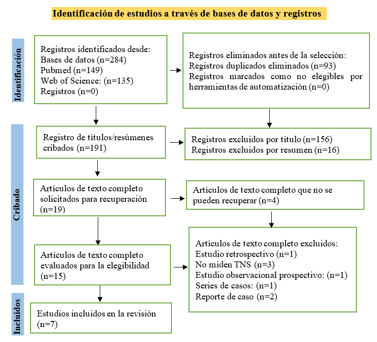 Se realizó una revisión de manera crítica y sistemática de la bibliografía acerca de la eficacia de los cannabinoides en el tratamiento de los TNS en la demencia, empleando la metodología PRISMA.(31) Se incluyeron resultados de ensayos controlados aleatorizados, estudios cruzados controlados aleatorizados y ensayos clínicos abiertos publicados desde 1996 hasta mayo del 2022 en las bases científicas PubMed y Web of Science. El procedimiento se realizó independientemente por dos investigadores para evitar sesgos.