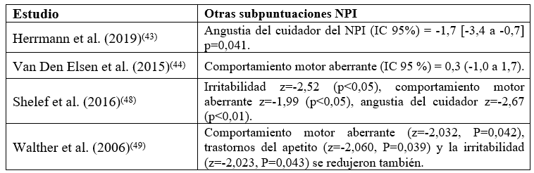 Por su parte, Shelef et al. (z=-2,52; p<0,05) y Walther et al. (z=-2,032; P=0,042) hallaron una reducción en la agitación/agresión al medir empleando NPI; mientras que, empleando CMAI, Volicer et al. reportaron la disminución de los efectos negativos en una evolución durante 12 semanas (F=2,46; df=5,143; p=0,045).(46,47,48)