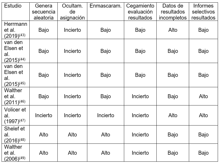 32. Higgins JPT, Altman DG, Gøtzsche PC, Jüni P, Moher D, Oxman AD, et al. The Cochrane Collaboration’s tool for assessing risk of bias in randomised trials. BMJ [Internet]. 2011 [citado 06 Jun 2022]; 343(5928): 1–9. Disponible en: https://www.bmj.com/content/343/bmj.d5928. https://doi.org/10.1136/bmj.d5928.