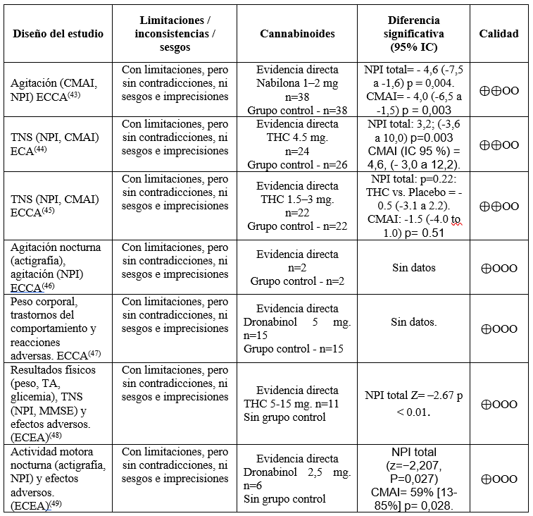 Los efectos significativos de los cannabinoides sobre las TNS en personas con demencia (CMAI = −0,80 (IC 95%), [−1,45 a −0,16]; NPI = −0,61 (IC 95%),[ −1,07 a −0,15]), quedaron establecidos por autores de una revisión sistemática con metaanálisis.(50)
