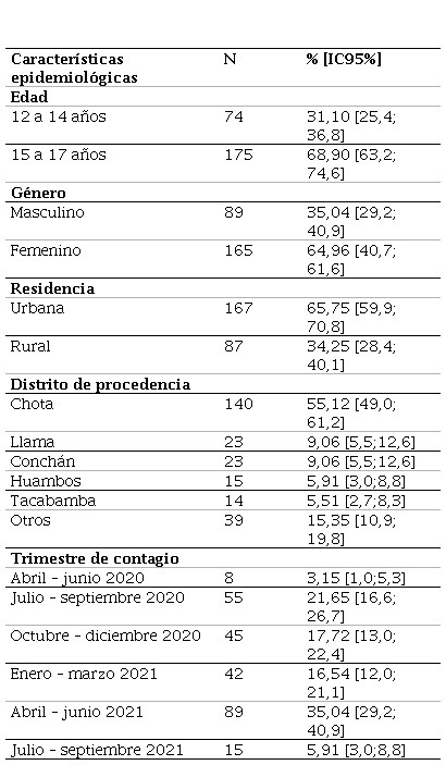 El análisis de las características epidemiológicas permitió establecer la presencia de mayor incidencia del grupo etario de 15 a 17 años (68,9%), el género femenino (65%), la residencia en un sector urbano (65,7%), la procedencia del distrito de Chota (55,1%) y de quienes fueron diagnosticados en el periodo abril - junio de 2021 (35,04%) (tabla 1).