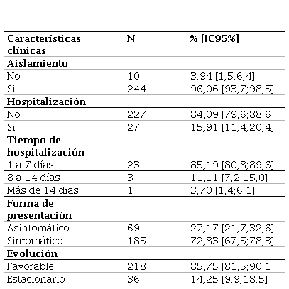 Las características clínicas más frecuentes observadas fueron el aislamiento domiciliario (96,1%), el no requerimiento de hospitalización para tratamiento (84,1%), el tiempo de hospitalización de 1 a 7 días (85,2%), la manifestación de síntomas (72,8%) y la evolución favorable (85,8%) (tabla 2).