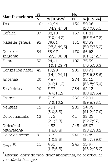 Las manifestaciones clínicas que predominaron en los participantes fueron: tos (40,9%), cefalea (38,2%), malestar general (36,6%), dolor de garganta (33,1%) y la fiebre (24,4%) (tabla 3).