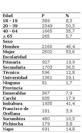 Entre los consultados predominó el grupo de edades entre 20 y 39 años (50,3%), el sexo femenino (53,6%) y la residencia en la provincia de Imbabura (41,4%) (tabla 1).