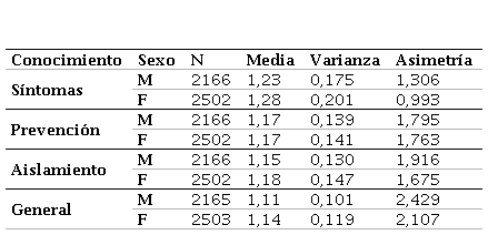 Los valores de las medias oscilaron entre 1,11 y 1,28; indicando un predominio del estado adecuado de los conocimientos sobre cuidados de pacientes diagnosticados con Covid-19; aunque, la mayoría de los valores de asimetría son mayores que la media (tabla 2).