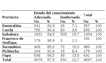 Los resultados mostraron que un 87,3% de los participantes tenían un conocimiento adecuado acerca de la prevención y el cuidado ante la epidemia de Covid-19, siendo los valores obtenidos en la provincia Francisco de Orellana los más favorables (98,9% de individuos con conocimiento adecuado) (tabla 3).