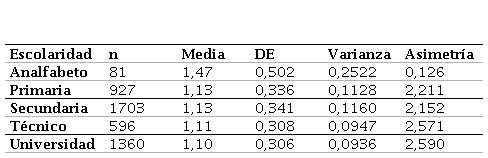 La mayoría de la población de estudio tenía nivel de escolaridad de segundaria (1703). Las cifras de las medias aritméticas y asimetría indicaron que entre los involucrados analfabetos existía la mayor presencia de conocimientos inadecuados sobre cuidados domiciliarios de pacientes con Covid-19 (tabla 4).