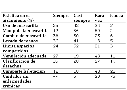 Los datos sobre las prácticas recomendables durante el aislamiento por Covid-19 que cumplían los participantes permitieron establecer el predominio de cuidadores sin enfermedades crónicas (75%), los que no manipulaban la mascarilla y el hecho de compartir habitación (tabla 5).
