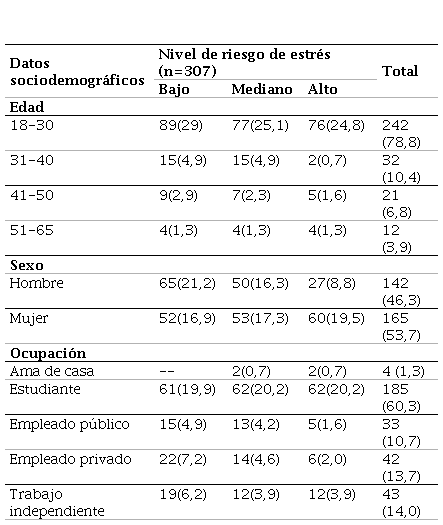 Abstract: This research aimed to establish the association between body mass index and perceived stress in a group of Ecuadorian adults and determine the predictive capacity of some sociodemographic variables concerning body mass index. The study had an observational design, associative scope, and cross-sectional, in which 307 adults between 18 and 65 years of age were included through a snowball procedure. Data were collected using the Perceived Stress Scale and two additional sections for general data and anthropometric measurements. It was found that 36.8% of the study population was overweight or obese. In comparison, 77.5% had a medium risk of stress, with women being the most affected, without sex being statistically associated with body mass index or risk of stress. In the investigated population, the age group between 18 and 30 years old, the female sex, and those who declared they were students when filling out the instrument predominated. The adjusted R square value indicated that the sociodemographic variables studied grouped predicted BMI in the investigated environment.