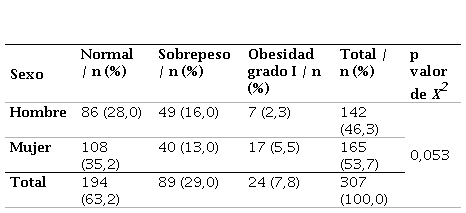 La media del IMC en mujeres quedó establecida en 23,53 kg/m.; mientras que en los hombres fue de 24,15 kg/m.. El 38,8% de la población estudiada presentaba problemas de sobrepeso u obesidad grado I, observándose mayor presencia de sobrepeso en los hombres (16%) y de obesidad tipo I en las mujeres (5,5%). El resultado de la prueba de chi cuadrado (p=0,053) indicó que no existe asociación estadísticamente significativa entre las variables IMC y sexo (tabla 2).