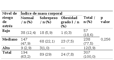 La mayoría de los participantes se catalogaron con un nivel mediano de riesgo de estrés, sin que se observara asociación estadísticamente significativa de esta variable con respecto al IMC.