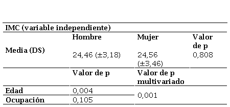 El análisis de covarianza entre IMC y sexo permitió observar valores bastante similares de desviación estándar en ambos sexos: hombres (±3,18) y mujeres (±3,46). Asimismo, el valor de R cuadrado ajustado indicó que el grupo de variables sociodemográficas estudiadas, vistas como conjunto, eran predictoras de IMC en el entorno investigado (p=0,001) (tabla 4).