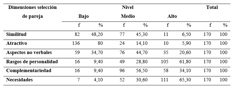 En lo que respecta a la importancia de criterios de selección de pareja, se evidencia que: los rasgos de personalidad y la satisfacción de necesidades tienen una alta consideración de importancia para los investigados; los aspectos no verbales y complementariedad tienen una importancia media; mientras que la similitud y el atractivo los consideran de baja importancia.