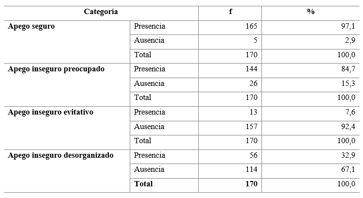 En lo referente al apego, la mayor parte de los padres de familia participantes muestran un tipo de apego seguro e inseguro preocupado. De la misma manera, la gran mayoría no presenta un tipo de apego inseguro evitativo e inseguro desorganizado (tabla 2).