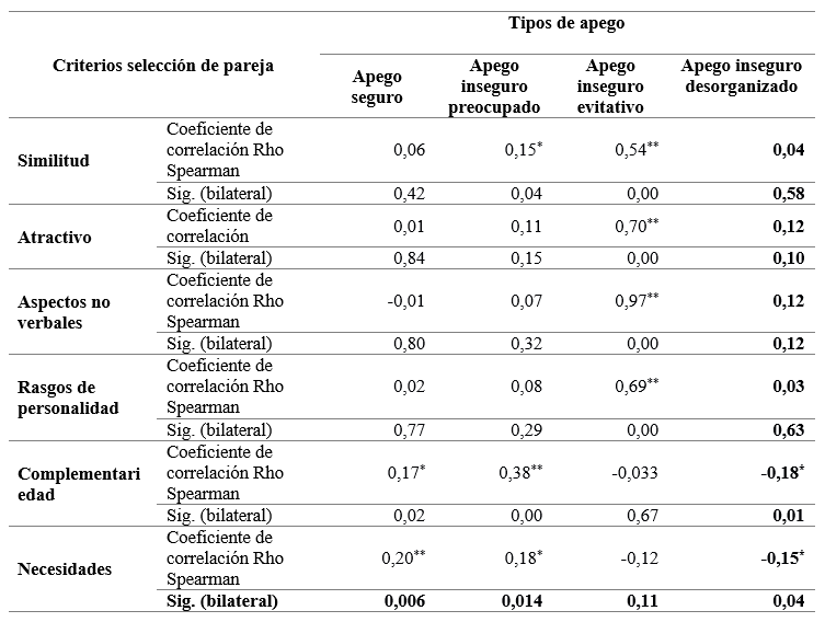 Como se evidencia en la matriz de correlaciones (tabla 3) existe una correlación positiva y significativamente moderada entre el tipo de apego inseguro evitativo con el criterio similitud en la selección de pareja (r = 0,54; p < 0,05). Mientras que este tipo de apego también demostró presentar una correlación positiva y significativamente alta con los criterios atractivo (r = 0,70; p < 0,05); aspectos no verbales (r =0,97; p < 0,05) y rasgos de personalidad (r = 0,69; p < 0,05). Se pudo también determinar que el tipo de apego inseguro preocupado mantiene una correlación positiva significativamente moderada con el criterio complementariedad (r = 0,38; p < 0,05). Finalmente, se observó una relación positiva significativamente moderada entre el tipo de apego seguro y el criterio satisfacción de necesidades (tabla 3).