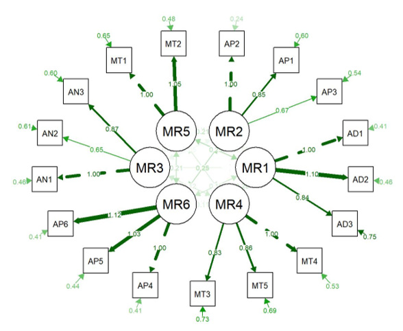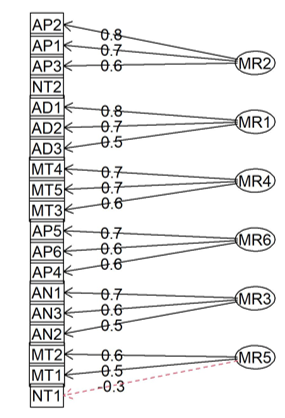 Los factores se muestran en la Figura 2 y pueden ser interpretados, MR2: actitudes positivas (AP2, AP1, AP3); MR1: ansiedad/dependencia (AD1, AD2, AD3); MR4: multitrabajo/tareas cotidianas (MT4, MT5, MT3); MR6: percepciones de la tecnología (AP4, AP5, AP6); MR3: actitudes negativas (AN1, AN2, AN3); MR5: multitrabajo/redes sociales (MT1, MT2).
