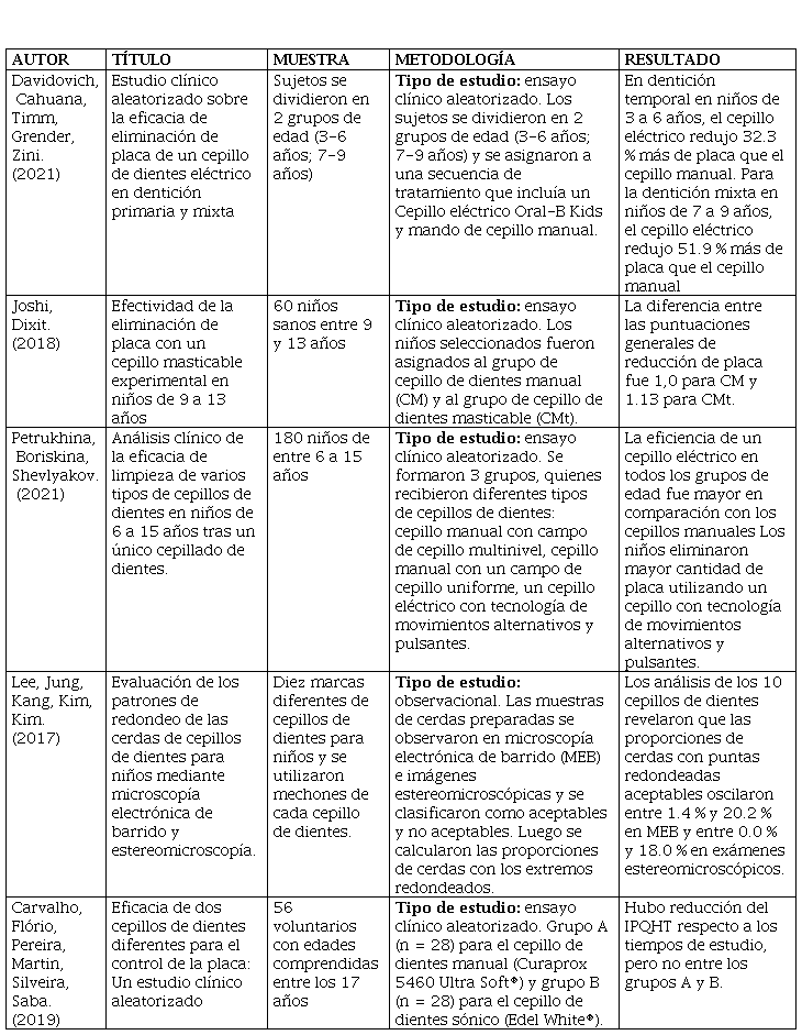 Mediante la realización del presente estudio, se determinó que los cepillos más adecuados para el cepillado dental son los eléctricos, debido a que ayudan a reducir de manera eficaz la placa bacteriana tanto en dentición temporal como en dentición mixta. Algo similar ocurre con los resultados del trabajo de investigación realizado por Nightingale et al,(29) en donde hacen una comparación entre un cepillo manual con un eléctrico, observando una mayor reducción de placa en el grupo que usaron estos últimos cepillos, por tal razón, los investigadores concluyeron que estos tipos de cepillos eliminan de forma segura y eficaz más placa que un cepillo manual. Otro estudio desarrollado por Bahammam et al,(30) concuerdan con los resultados obtenidos, quienes afirma que los cepillos eléctricos son más eficientes que los cepillos manuales, debido a que ayudan a eliminar la placa de forma más funcional incluso en menor tiempo de cepillado. Adicionalmente Adam et al,(31) comparan cepillos de dientes oscilantes-rotativos versus cepillos de dientes sónicos, dando como resultado que los cepillos con microvibraciones tuvieron mejores resultados en la reducción de placa dental. Algo similar ocurre con los resultados presentados por Torres et al,(32) en su estudio, quienes sugieren la utilización de cepillos eléctricos, afirmando que este tipo de cepillos disminuyen la dificultad de la higiene bucal y a su vez ayuda a eliminar mayor cantidad de placa. Pérez & Chelin,(33) presentan datos muy similares a los obtenidos, en el que afirman que la eficacia de los cepillos eléctricos es mayor en comparación a los cepillos manuales durante la remoción de placa bacteriana. No obstante, Petker et al,(34) discrepan de los resultados obtenidos en este estudio, determinando que no existe ninguna ventaja del cepillado dental eléctrico diario en comparación con el cepillado manual, debido a que en su estudio no evidenció diferencias significativas. Así como también se consideran aceptables aquellos cepillos con cerdas recortadas planas con bordes redondeados en ambos extremos, debido a que facilita la limpieza de los dientes al poder ingresar y eliminar la placa dental. Estos datos son similares a los obtenidos por Caporossi et al,(35) estableciendo que los cepillos con cerdas de puntas redondeadas eliminan la placa de forma eficaz sin causar abrasión gingival en comparación con cepillos que tienen cerdas cónicas, cabe recalcar que no se han encontrado estudios que afirmen lo contrario sobre el tipo de cerdas.