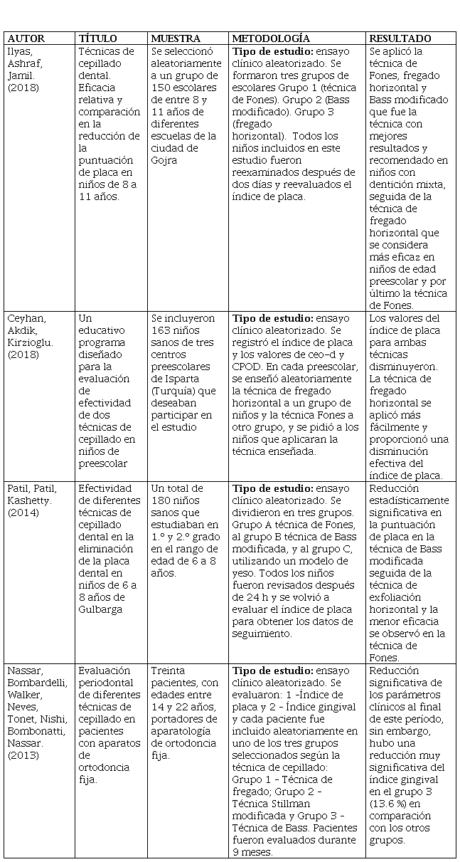 Las investigaciones presentadas en la siguiente tabla evaluaron diferentes técnicas de cepillado para determinar cuál es la más eficaz en la reducción del índice de placa bacteriana, son ensayos clínicos aleatorizados realizados con niños en edad escolar. En los estudios realizados por Ilyas et al,(16) y Patil et al,(17) la metodología utilizada consistió en realizar un registro y evaluación clínica al inicio del estudio para posterior ser divididos en tres grupos y enseñar a cada grupo una técnica de cepillado determinada como la de Fones, la técnica de fregado horizontal y la de Bass modificada. Los niños fueron reexaminados después de 24 y 48 horas para hacer una comparación de los índices de placa, coincidiendo los autores sobre la mayor eficacia de la técnica de Bass modificada, seguida de la técnica de fregado horizontal y la menos eficaz la técnica de Fones. Otro estudio similar realizado por Ceyhan et al,(18) comparan la técnica de fregado horizontal y la técnica de Fones, tomando diferentes mediciones del índice de placa a la semana, al mes, a los tres y seis meses, reflejando los resultados que la técnica de fregado horizontal se aplicó con mayor facilidad y a su vez proporcionó una reducción efectiva del índice de placa. Un último estudio realizado por Nassar et al,(19) comparan la técnica de fregado, la técnica de Stillman y la técnica de Bass; evaluaron el índice de placa y el índice gingival durante un período de 9 meses. Los resultados reflejaron que hubo una disminución de placa en todos los grupos, sin embargo, hubo una reducción más significativa en el grupo que emplearon la técnica de Bass, considerando esta técnica como la más eficaz para mantener la salud periodontal (Tabla 2).