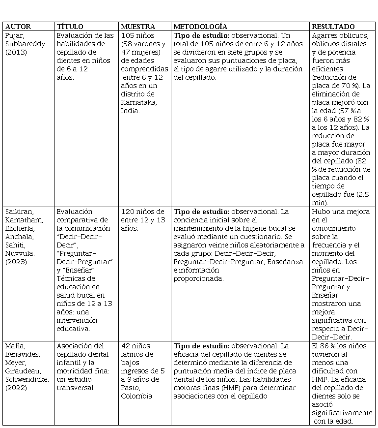 22. Mafla A, Benavides R, Meyer P, Giraudeau N, Schwendicke F. Association of children’s toothbrushing and fine motor skills: a cross-sectional study. Braz Oral Res. [Internet]. 2022 [citado 18 Nov 2023]; 36. Disponible en: https://www.scielo.br/scielo.php?script=sci_arttext&pid=S1806-83242022000100285.