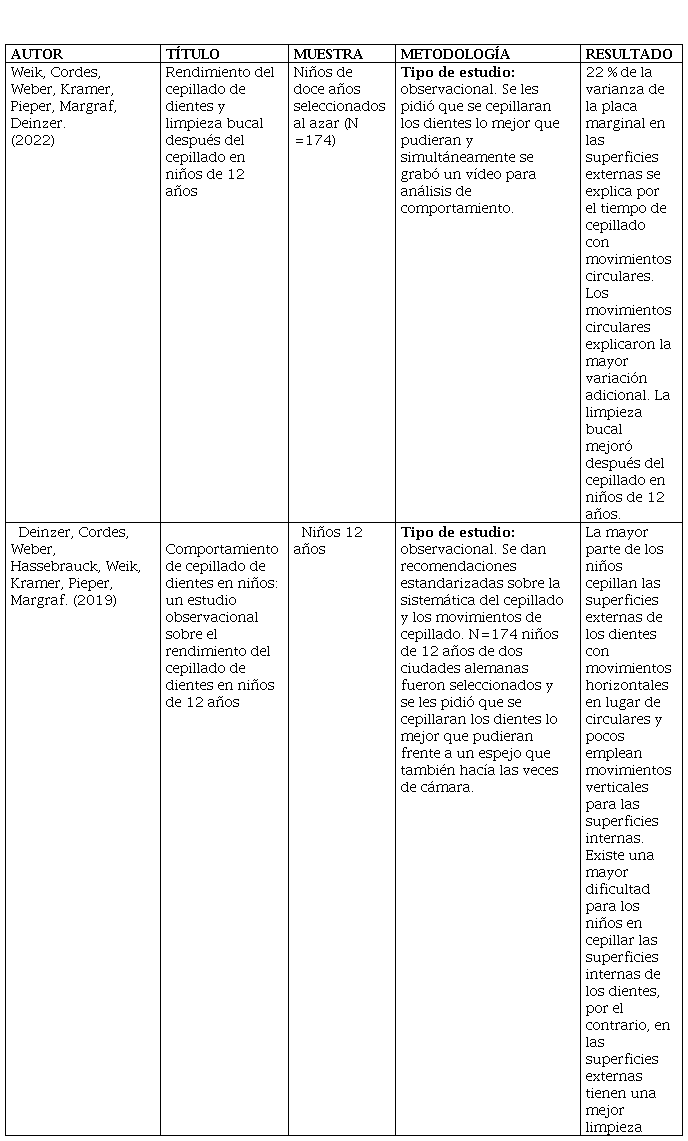 En lo que respecta al comportamiento de cepillado de dientes en niños, Weik et al,(23) y Deinzer et al,(24) realizaron estudios que evalúan la conducta de los escolares al momento de ejecutar el cepillado. Son estudios realizados en niños de 12 años, donde lograron observar que los niños cepillaban sus dientes durante al menos 200 segundos, pero solo el 7.5 % de los niños cepillan tanto las superficies internas como externas utilizando movimientos verticales y movimientos circulares respectivamente (Tabla 4).
