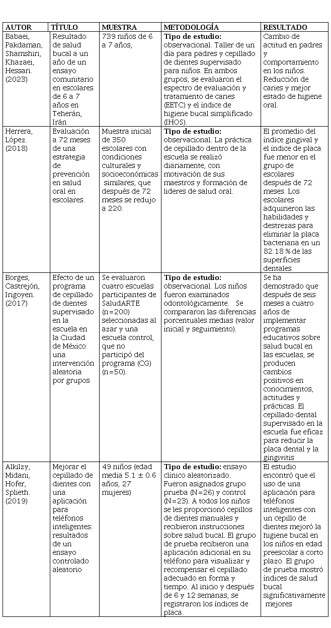 Según Babaei et al,(25) desarrollan un programa de salud oral, enfocado en padres y niños; lo que contribuyó al cambio de actitud en los padres y el comportamiento de los niños, mejorando su estado de salud oral mediante una correcta higiene. Por tal razón, los autores aconsejan el cepillado supervisado desde aproximadamente los 6 meses a los 7 años y durante al menos dos veces al día, en la mañana y antes de dormir. Herrera et al,(26) realizaron una evaluación a 72 meses de una estrategia de prevención en salud oral, donde participaron 350 escolares para la práctica diaria del cepillado dental con la ayuda motivacional de sus maestros. Teniendo como resultado una disminución del índice de placa, ayudando a los niños a adquirir habilidades y destrezas necesarias para eliminar la placa dental. En otro estudio realizado por Borges et al,(27) observan la eficacia del cepillado dental supervisado por un período de tiempo de tres meses, años después dando como resultado cambios positivos en los niños tanto en conocimientos, actitudes y prácticas siendo un método eficaz para reducir la placa. En el estudio realizado por Alkilzy et al,(28) implementan una aplicación con la finalidad de mejorar el cepillado en niños en edad preescolar; dividiendo a los niños en dos grupos, uno de control y otro de prueba, este último grupo recibió una aplicación para su teléfono y de esta forma poder visualizar y recompensar el cepillado supervisado. Después de 6 y 12 semanas se registraron los índices de placa, evidenciando que el uso de la aplicación mejoró la higiene oral de los niños con una mayor reducción de placa y mejorando su salud oral (Tabla 5).