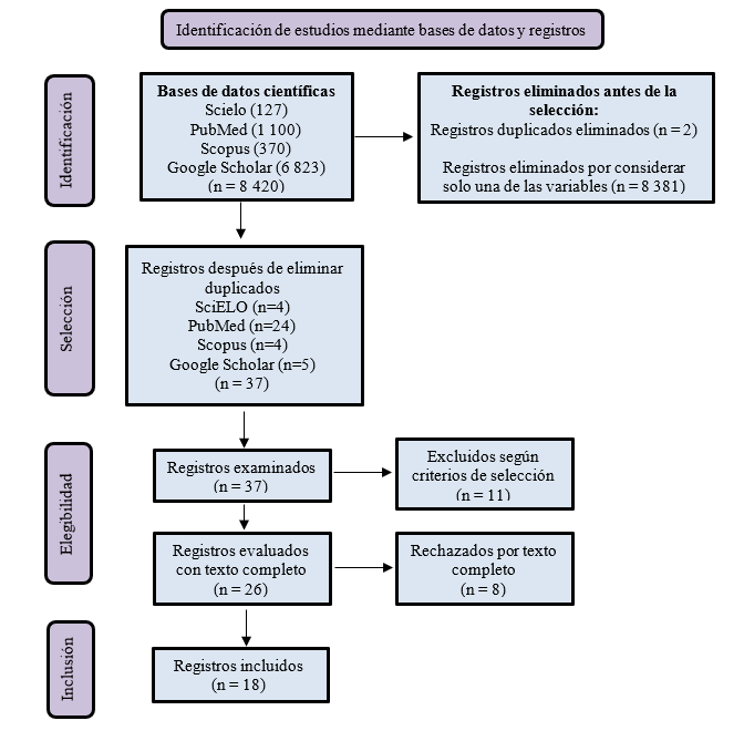 La información obtenida fue manejada mediante el protocolo PRISMA (Figura 1), (10) el cual sirve de ayuda en revisiones sistemáticas, permitiendo hacer una síntesis de los procedimientos realizados para la selección de la información. Adicionalmente se detalló el número de artículos científicos identificados, seleccionados, elegidos e incluidos para el desarrollo del estudio.