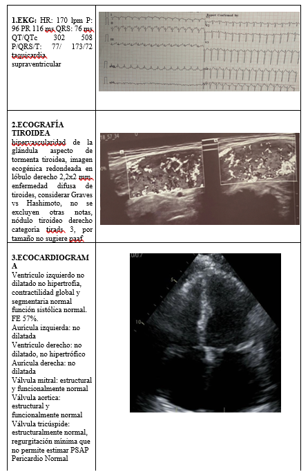 Familiar de paciente refiere cuadro clínico de 2 meses de evolución caracterizado por mialgias, artralgias, pérdida de peso, debilidad generalizada, exacerbada hace 1 semana con sensación de palpitaciones, y hace 24 horas con fiebre. evidencian somnolencia, por lo trasladan al hospital, a su ingreso con signos vitales TA: 110/70 mmhg FC: 182 lpm. FR 20 rpm Sat O2: 94% T: 38.3ºC, Glasgow:14/15 (M:6 V:5 O: 3) electrocardiograma con taquicardia supraventricular, se realiza maniobras vágales y se administra antiarrítmicos sin presentar respuesta, previa sedación se realiza cardioversión sincronizada con 50 J, posterior se evidencia disminución de frecuencia cardiaca a 158 lpm y por antecedentes patológicos se realiza cálculo de escala de Burch y Wartofsky con puntuación de 50, por lo que se cataloga como crisis tirotóxica, realizaron estudios paraclínicos que incluyeron hormonas tiroideas, mismas que reportan THS ( hormona estimulante de la tiroides ) 0.23 IU/ml y FT4 ( tirotoxina libre ) mayor a 70 pmol/l , ingresa a la unidad de cuidados intensivos por 24 horas para manejo y monitoreo continuo, se inicia manejo con corticoide, metimazol, betabloqueante, paracetamol, luego de evento permanece en el área de medicina interna.