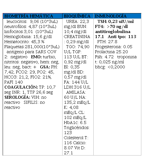 *Biometría hemática: normal,* SARS COV 2 antígeno para coronavirus negativo, *EMO: elemental y microscópico de orina: negativo, *GSA gasometría arterial: alcalosis respiratorio compensada, *TP tiempo de protrombina, INR international normalized, radio Tiempo de tromboplastina en parametros normales, *Perfil renal ( urea, bun, creatinina) : normales, *Perfil hepático TGO transaminasa glutámico oxalacética, TGP transaminasa glutámico piruvico, BT bilirrubina total BI: bilirrubina indirecta , BD: bilirrubina indirecta normales, FA fosfatasa alcalina, elevada LDH lactato deshidrogenasa, elevada, Amilasa normal *Electrolitos: NA sodio, normal, K potasio: normal, calcio: normal * Perfil metabólico: HbA1c Hemoglobina glicosilada normal, trigliceridos, colesterol normales, *Hormonas: pruebas tiroideas TSHhormona estimulante de tiroides: baja, Ft4 tiroxina > 70ng/dl : los niveles elevados de tiroxina libre en la sangre, puede ser causada por enfermedades como la enfermedad de Graves, la tiroiditis subaguda, tumores de tiroides o el consumo excesivo de hormonas tiroideas. Antitiroglobulina17.1: elevada se observa en tiroiditis autoimnune crónica, enfermedad de graves, nódulos tiroideos. Anti TPO: 13 elevada La presencia de anticuerpos antiperoxidasa tiroidea (anti-TPO) elevados en la sangre suele ser indicativa de enfermedad autoinmune de la tiroides. * Otras pruebas: PTH paratohormona normal Prolactina: normal, FSH hormona folículo estimulante: normal, Troponina: negativo, BHCG gonadotropina corionica humana: negativo, pruebas serológicas: HIV virus inmnunodeficiencia humana: no reactivo Sifilis: no reactivo.