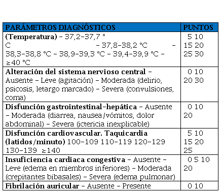 La escala de Burch y Wartofsky nos hacen considerar la gravedad y guiar el tratamiento, el diagnóstico se basa en la sumatoria de los puntos: