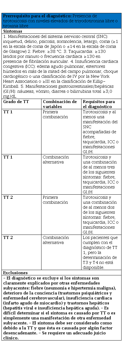 La importancia de la evaluación clínica para el diagnóstico de tormenta tiroidea debe realizarse de manera rápida en un paciente gravemente tirotóxico con evidencia de descompensación sistémica. Se debe considerar el uso complementario de un sistema de diagnóstico sensible como la escala de puntos de Burch-Wartofsky (BWPS) de ≥45 o categorías de tormenta tiroidea 1 (TS1) o tormenta tiroidea 2 (TS2) de la Asociación Japonesa de Tiroides (JTA). Aunque la incidencia de crisis tirotoxica es baja, el médico clínico debe conocer esta condición para ofrecer un diagnóstico temprano y tratamiento oportuno con la finalidad de disminuir las complicaciones y la alta mortalidad.