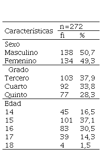 Respecto a las características sociodemográficas, hubo más varones representando poco más de la mitad de la muestra con 50,7 %; más de un tercio 37,8 % estuvieron en el tercer grado de educación secundaria. Y, más de un tercio de los estudiantes 37,1 % (101) tuvieron 15 años (Ver Tabla 1).