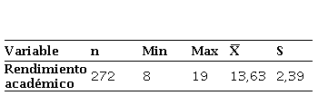 El rendimiento académico representado en la Tabla 3 se mostró que el promedio de las notas fue de 13,63 (±2,39) y un rango entre 8 a 19 en base a una calificación vigesimal.